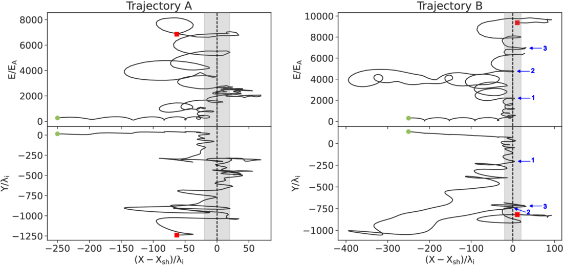 The trajectory of two typically accelerated PUIs. The top and bottom panels correspond to the particle energy and the particle Y-position, respectively. The particle X-position is shifted in time so that the shock front is always at X = Xsh (black dashed line). The gray-shaded area represents the typical maximum and minimum extent of the shock rippling. Green and red points correspond to the start and end locations, respectively, and the time duration between them is ﹩100{{\rm{\Omega }}}_{ci}^{-1}﹩. Blue arrows indicate specular reflection.