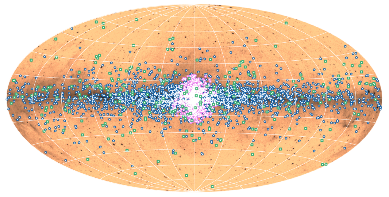 C1 (green squares) and C8 detections, with blue (pink) circles giving the disk/S1 (bulge/S3) population. The background image is an Aitoff projection in Galactic coordinates of the LAT γ-ray intensity. The concentration of sources at low latitudes, in regions of strong background, highlights the importance of angular resolution.