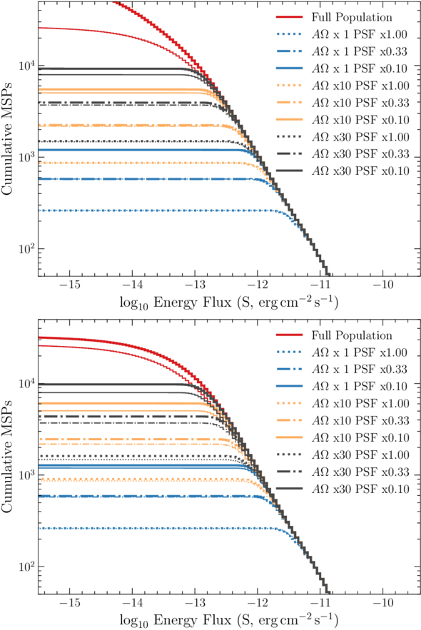 Distribution in energy flux for detected (TS > 100) MSPs in the disk+bulge population scenarios S2 and S3, and for the nine GeV-band concepts discussed in the text (heavier lines). Line colors and styles distinguish the nine concepts. The disk-only contributions, i.e., S1, are also shown (lighter lines). Top: In S2, the bulge population comprises 1.2 × 105 MSPs from an AIC pathway, and it is evident that relatively few of these bulge pulsars are detectable. Bottom: In S3, the bulge population comprises 6700 MSPs, assumed to share the same γ-ray emission properties as the disk. Due to their higher individual γ-ray luminosity, these pulsars are more detectable, particularly by instruments with a good PSF.