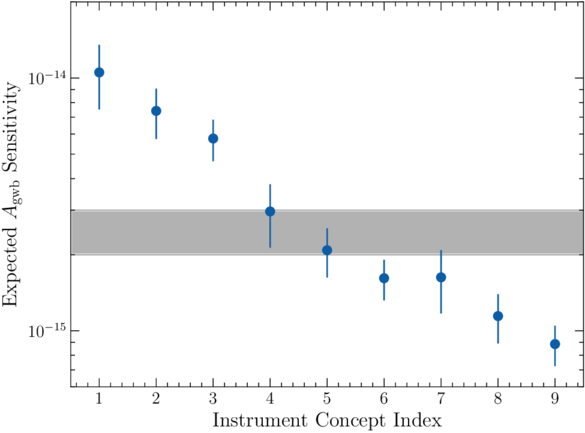 Limiting Agwb (at f = 1 yr−1) that could be detected with each of the nine γ-ray concepts discussed in the main text and Table 1. Only the results from scenario S1 are shown here since S2 and S3 are all but identical. The gray shaded region gives the approximate range of candidate GWB signals currently detected by radio PTAs, ﹩{{ \mathcal A }}_{15}=2﹩–3. Performance below the gray band enters the self-noise regime from the GWB, and other features of the PTA (e.g., sky coverage, number of pulsars) become consequential.