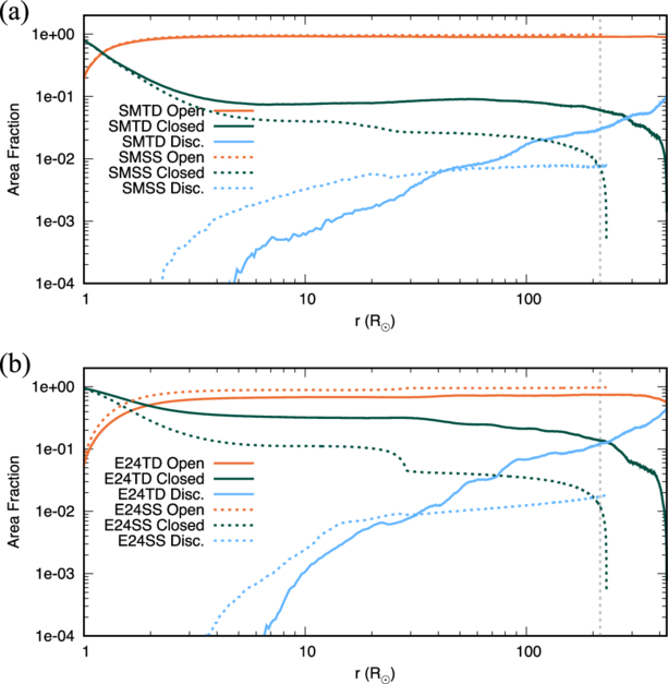 Area fractions of the spherical surface at different radii occupied by magnetic field lines of different connectivity: (a) SM runs; (b) E24 runs. The dotted vertical line is 1 au.