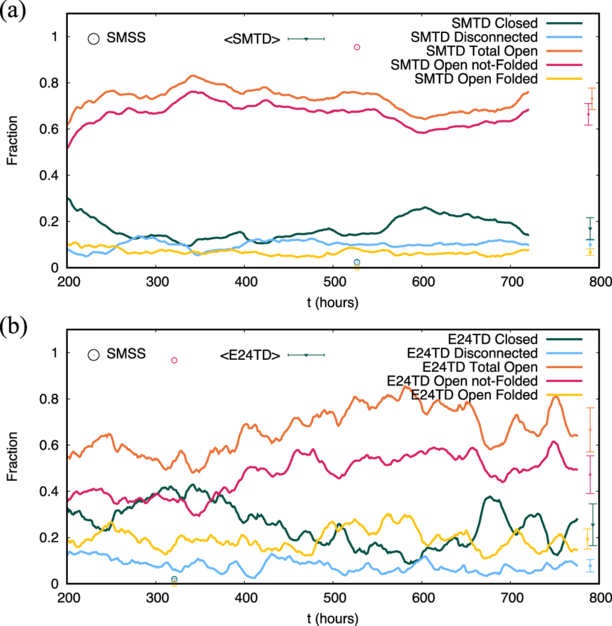 Connectivity fractions as a function of time in the ±6∘ latitude zone: (a) SM runs; (b) E24 runs. We have removed the first 200 hr of the simulations, during which the heliospheric relaxation phase occurs. Closed flux is green, disconnected is sky blue, open folded flux is gold, open not-folded is rose, and total open flux is orange. Average values with standard deviation errors from 200 hr to the end of the TD simulations are shown on the right within each plot. The values for the SS simulations are shown as circles at 526 hr for SMSS and 320 hr for E24SS.