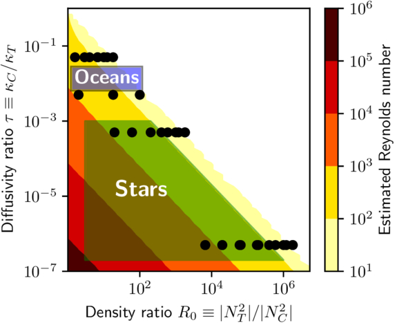 Different regimes in which thermohaline convection occurs (shaded regions) are compared against simulations presented in this work (black points) in terms of the diffusivity ratio τ (characterizing the thermal diffusivity) and the density ratio R0 (characterizing the stratification). Filled contours show the estimated Reynolds number of the flows (detailed in the main text). Thermohaline convection in oceans typically occurs with τ ∼ 10−2; in stars, the possible values of τ vary dramatically but are generally much smaller. Previous 3D simulations have explored τ ≳ 10−2 extensively, while the present work considers simulations with much smaller τ.