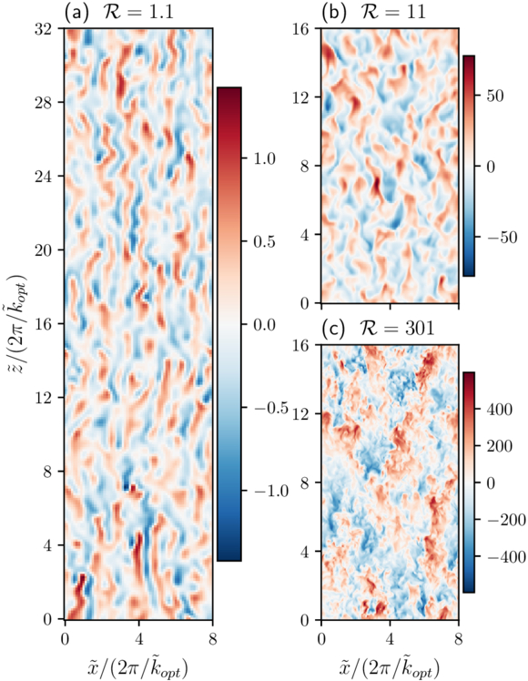 Snapshots of the vertical velocity ﹩{\tilde{u}}_{z}﹩ at ﹩\tilde{y}=0﹩ in the saturated state for simulations with Pr = 10−6, τ = Pr/2, and (a) ﹩{ \mathcal R }=1.1﹩, (b) ﹩{ \mathcal R }=11﹩, and (c) ﹩{ \mathcal R }=301﹩ (or ε = 0.1, 10, and 300). As ﹩{ \mathcal R }﹩ increases, velocity fluctuations increase and develop finer structures.