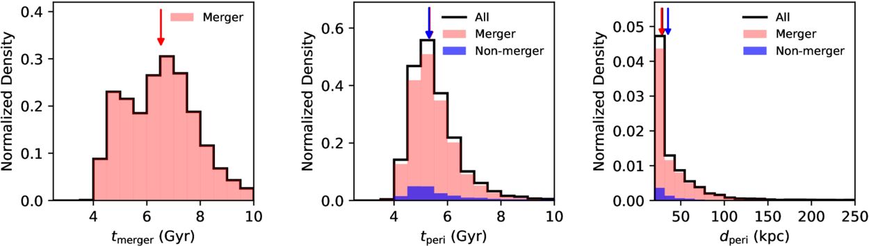 Distribution of merger and pericenter outcomes in the fiducial four-body simulations. Left: normalized probability density of merger times (tmerge) for merger outcomes among all 10,000 realizations. Middle: normalized probability density of the first pericenter times (tperi) for both merging and nonmerging outcomes, with the black outline showing all cases. Right: same as the middle panel, but for the distribution of the first pericenter distances (dperi). In each panel, the colored arrows indicate the median values of the corresponding distributions. In the middle panel, the three median arrows nearly overlap due to similar first pericenter times across outcomes.