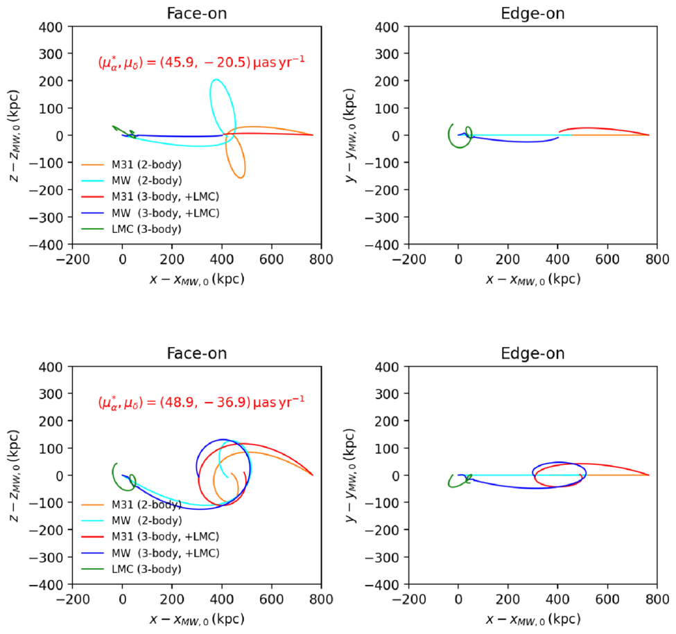 Effect of the LMC-induced reflex motion on the MW–M31 orbital tracks for two representative M31 PMs (top: values from H. Wu et al. 2025, used in our fiducial model; bottom: values from J. B. Salomon et al. 2021, used in S25’s fiducial model). Tracks are projected face-on (left) and edge-on (right) relative to the MW–M31 orbital plane, which is defined by the initial positions and velocities of the MW and M31. Curves compare the two-body configuration (MW and M31 only) with the corresponding three-body case including the LMC. In the H. Wu et al. (2025)–like cases, the LMC-induced reflex motion makes the trajectory more radial and promotes the MW-M31 merger, whereas in the J. B. Salomon et al. (2021)–like case, it increases the tangential velocity component and suppresses the merger.