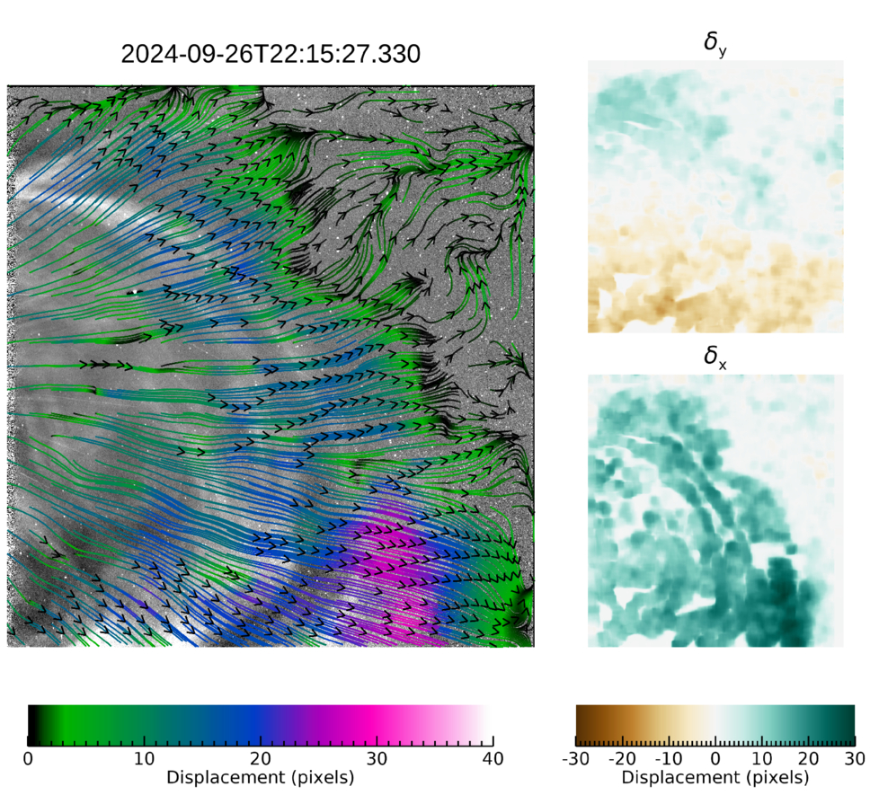 Results from the application of the optical flow. We represent the displacements as streamlines over the corresponding WISPR image in the left panel. The bottom right and top right panels indicate the displacements of each pixel in the horizontal δx and vertical δy directions, respectively. The color bar associated with these two panels is shown below them. An animation describing the overall evolution of streamlines and displacements is available in the online version of the journal. The total runtime is 12 s.