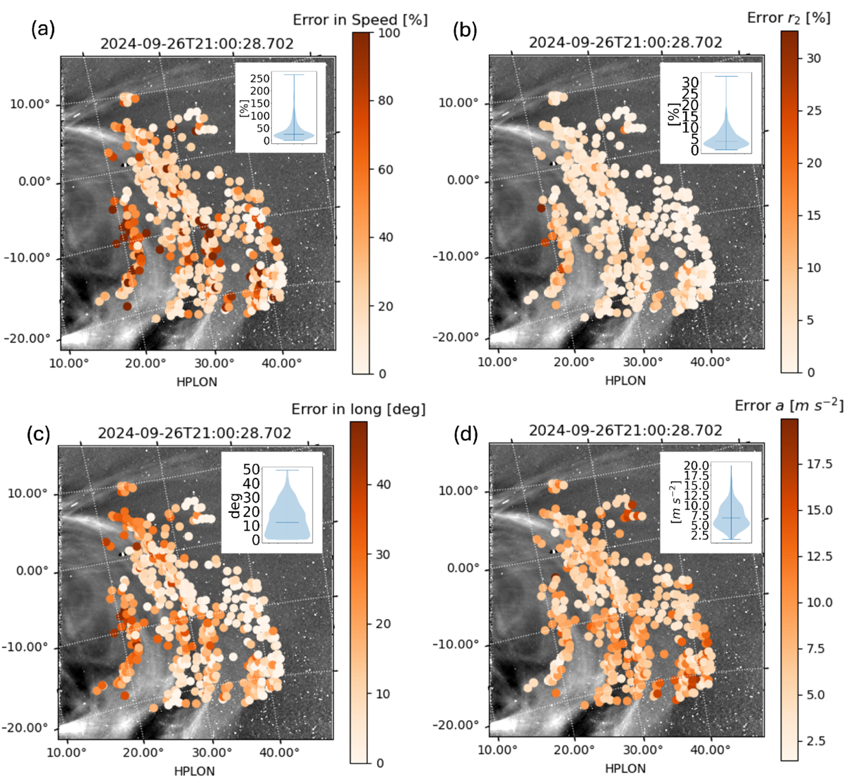 Errors in (a) initial speed, (b) r2(t0), (c) longitude, and (d) acceleration for each selected point projected on a WISPR-I image, as determined by the residual. Each error in speed and position is normalized by the respective value. The insets in each panel show violin plot distributions of errors, with horizontal lines indicating the minimum, median, and maximum values.