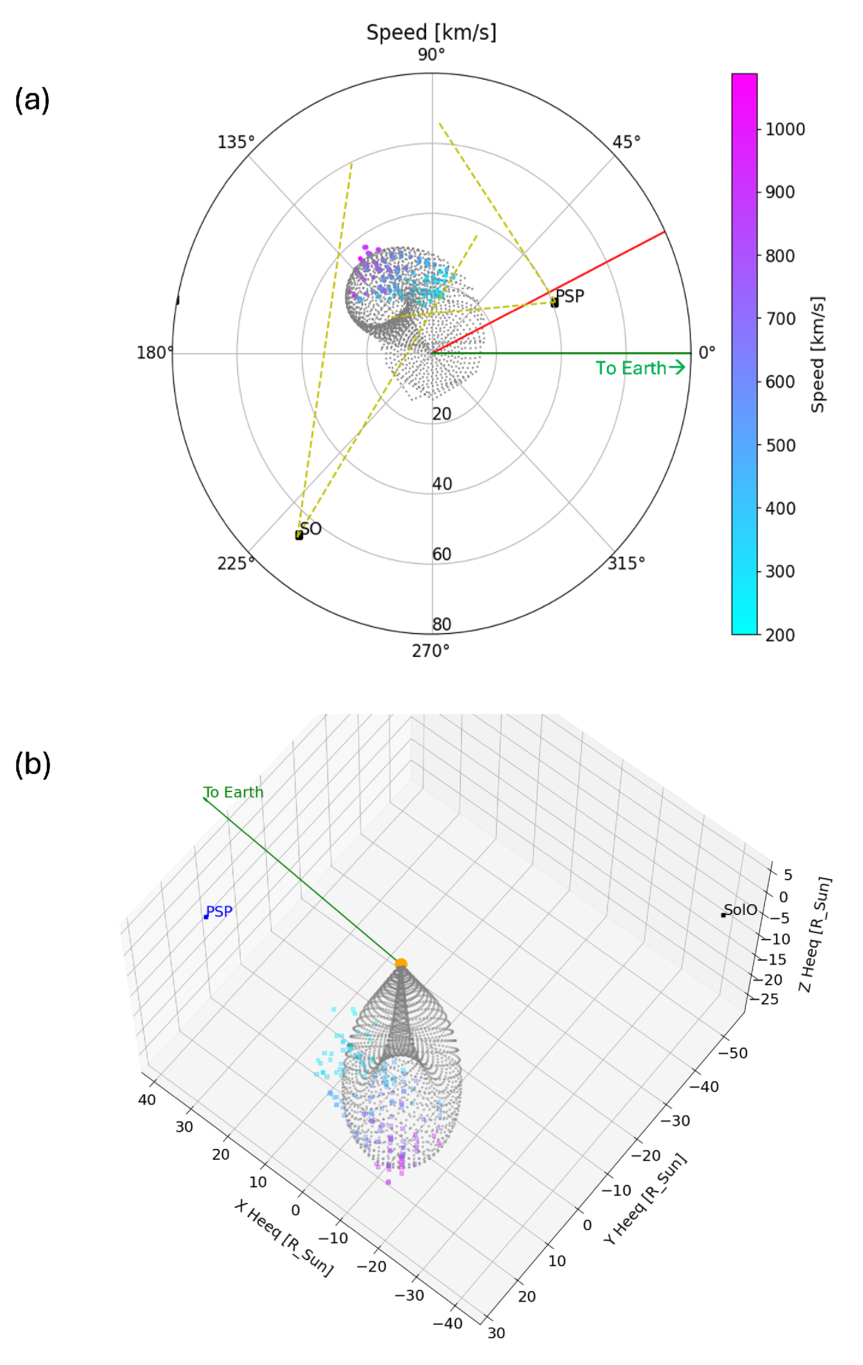 (a) Heliospheric polar view (from north downward) comparing GCS and MOSAIK3D results at 2024 September 26 21:00 UT. The FOVs from SoloHI (tiles 1 and 2) and WISPR-I are indicated by the yellow dashed lines. The red and green lines indicate the direction to STEREO-A/SECCHI and SOHO/LASCO, respectively. (b) Same as panel (a), but in a 3D plot. PSP and SolO are represented by the blue (left) and black (right) squares, respectively. An animation is available in the online version of the journal for panel (b), where the 3D plot is rotated 360° along the z-axis. The total runtime is 12 s.