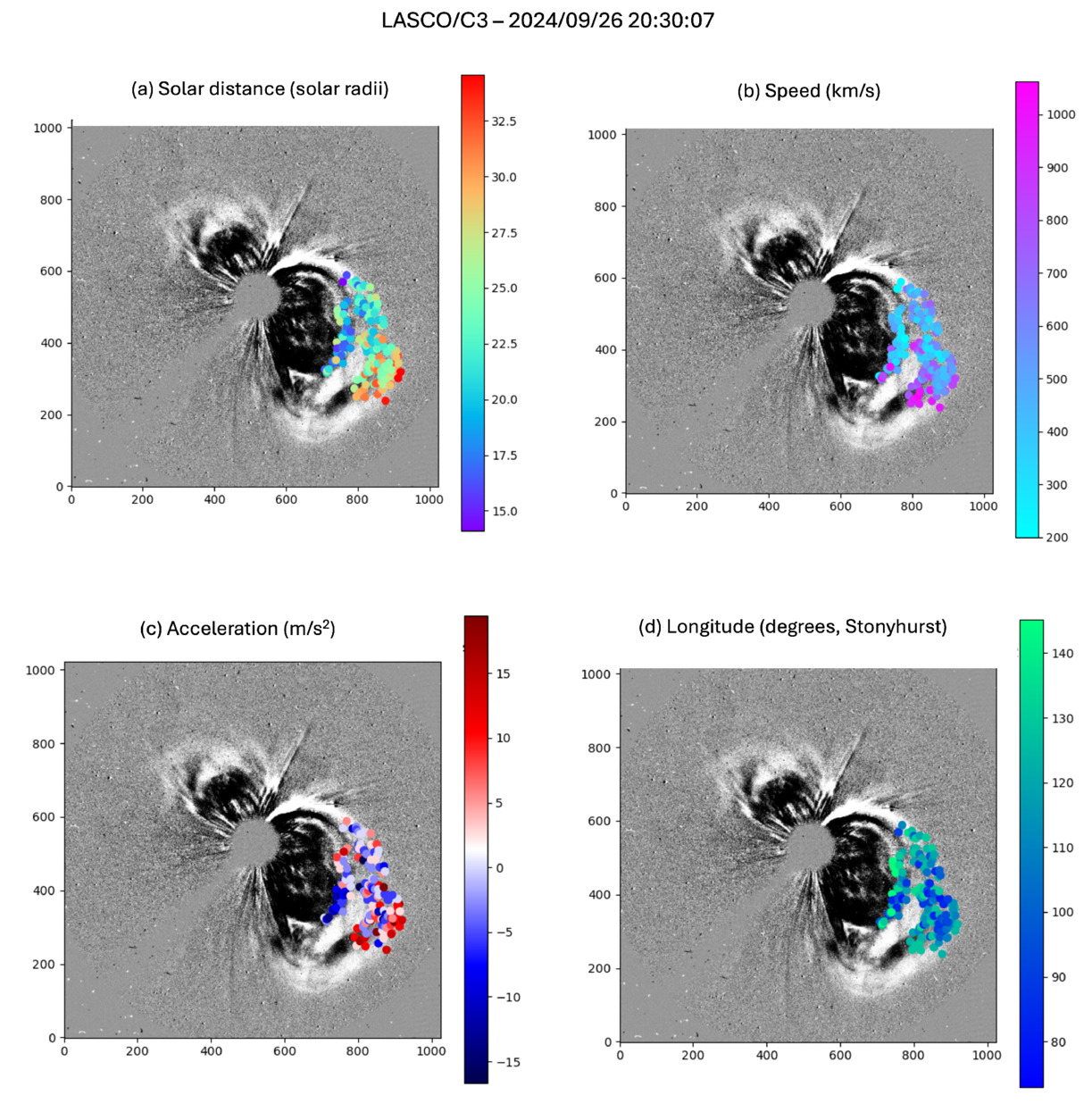 Projection points derived with MOSAIK3D over a LASCO/C3 image from 2024 September 26 20:30:07. Each panel illustrates a different parameter superposed to the image, namely, (a) heliocentric distance, (b) speed, (c) acceleration, and (d) Stonyhurst longitude.