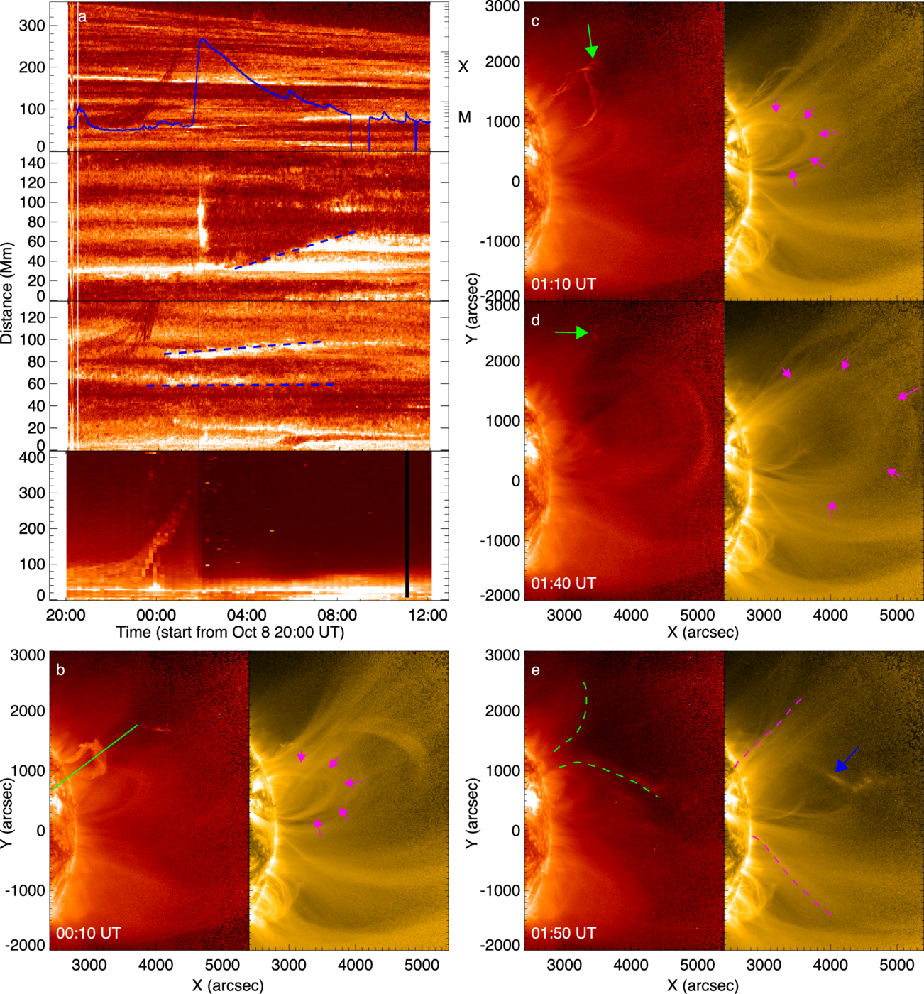 Off-limb observations of the rising filament (prominence) by SolO. (a) Time–distance plots from the slits of Figures 1(a) and (b). GOES X-ray flux is overplotted. The blue dashed lines indicate the separation motions of flare ribbons. (b)–(e) Evolution of the filament (indicated by green arrows) by EUI/FSI 304 Å and 174 Å. The magenta arrows indicate the expansion of the overlying loop above the AR. The blue arrow marks the coronal loops distorted by the filament eruption. An animation of panels (b)–(e) that showcases the QF and AR eruptions in the FSI from 00:00 to 03:00 UT (1 s duration).