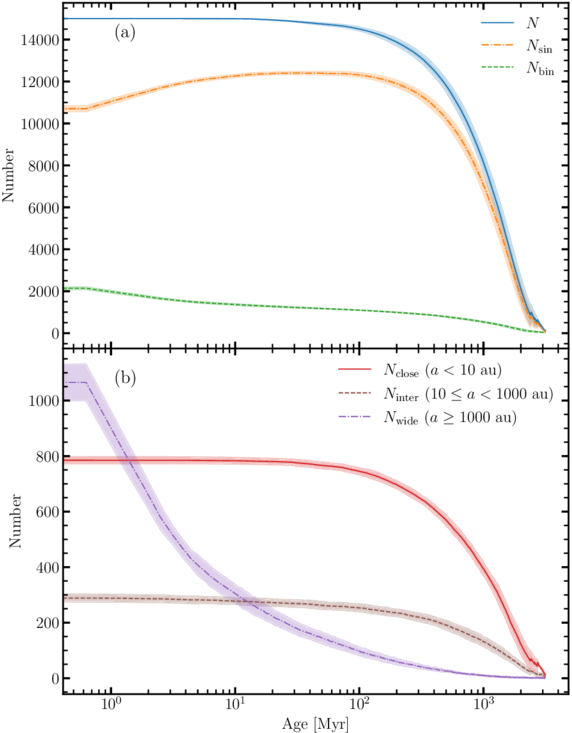 (a) Evolution of total number of stars (blue), single stars (orange), and binaries (green) of the simulation set N15k_10hb_40sb from Table 1. (b) Number of close, intermediate (brown), and wide (purple) binaries for the same simulation set. Solid curves and shaded regions represent the mean and standard deviation values among randomized models in the set.