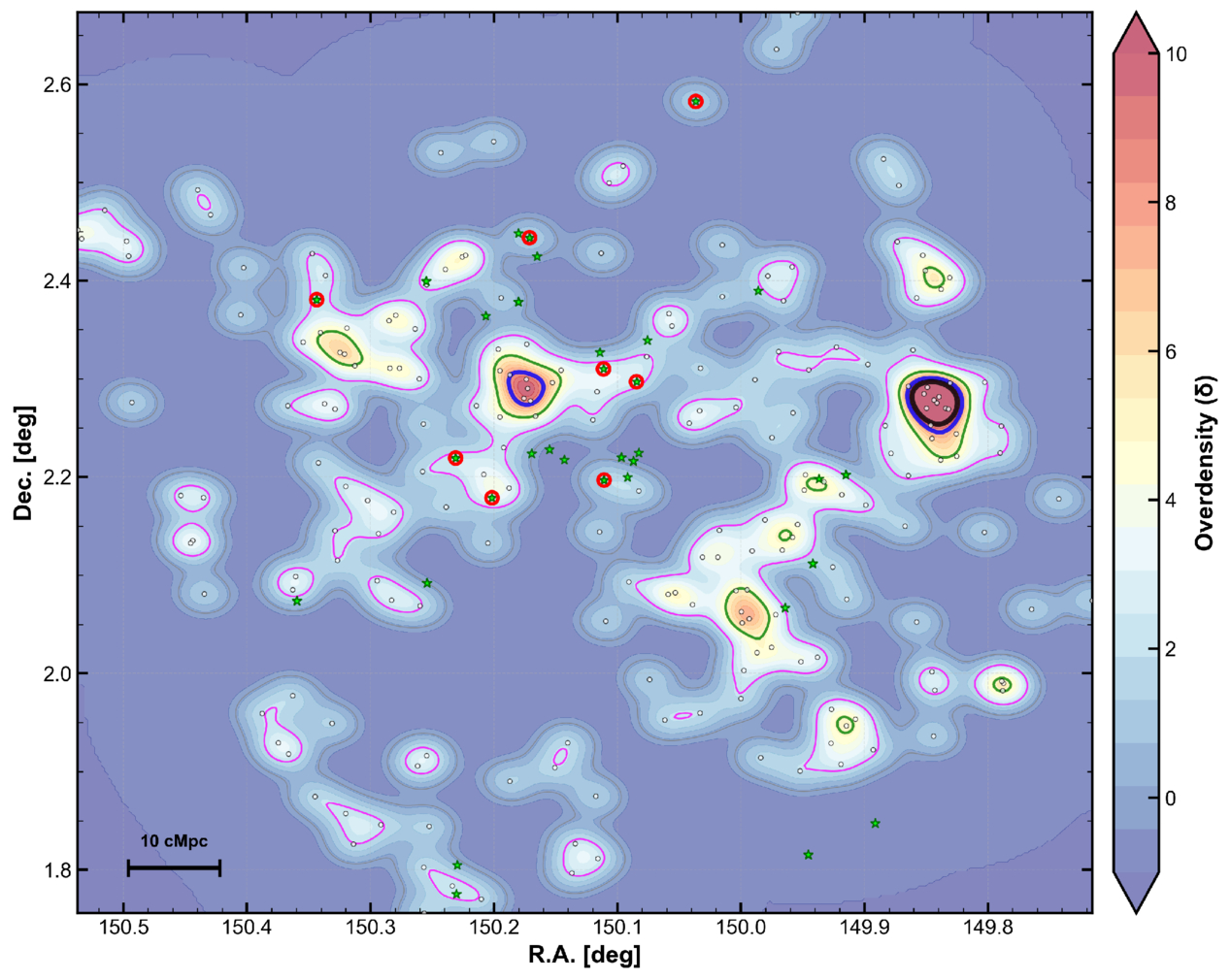 Overdensity map of NB718 LAEs at z = 4.90 revealing a large-scale protocluster structure (the Loktak protocluster) within the 0.54 deg2 COSMOS-Web survey area. The background shows the KDE-smoothed density field (color bar: δ), with warmer colors indicating higher overdensity. Contour lines trace overdensity levels at δ = 2 (magenta), δ = 5 (green), δ = 8 (blue), and δ = 10 (black). Individual LAE positions are shown as white open circles. Spectroscopically confirmed galaxies at z ≃ 4.9 are marked as green stars, while those cross-matched with our LAE sample (within 0﹩\mathop{.}\limits{^{\prime\prime} }﹩5) are further highlighted with red open circles overlaid on the stars. The structure exhibits a prominent primary peak (fourfold surface density enhancement within 1.5 pMpc radius), along with three additional significant peaks at distances of 7.6, 6.0, and 11.1 pMpc from the center, forming an interconnected protocluster complex spanning ∼65 × 36 cMpc2, characteristic of large-scale structures at this epoch.