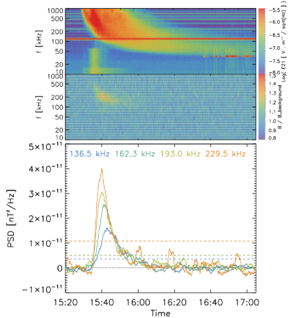 Spectrograms (top) of the E21 electric field and normalized magnetic field obtained from RPW/TNR measurements and (bottom) background-subtracted time series of magnetic field power spectral density (PSD) at four frequencies. Dashed lines represent the 5σ level of the background variations over the same time period.