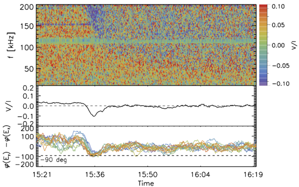 Circular polarization of the radio burst observed by SolO/RPW/TDS. The top panel shows the ratio of the Stokes parameters ﹩V=-i\left[{E}_{y}{E}_{z}^{* }-{({E}_{y}{E}_{z}^{* })}^{* }\right]﹩ and ﹩I={E}_{y}{E}_{y}^{* }+{E}_{z}{E}_{z}^{* }﹩ versus time and frequencies, and the second panel shows the frequency integrated ratio over 167–195 kHz. A negative value indicates a right-handed circular polarization, meaning that the electric field is rotating clockwise when looking in the direction of propagation. The line near 115 kHz is due to spacecraft interference. The third panel shows the phase difference between Ey and Ez for each frequency within the same frequency range but with a 2 kHz resolution.