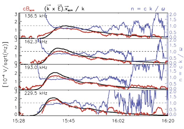 SolO: time series of cBSCM (red), ﹩\sqrt{{E}_{y}^{2}{c}_{y}^{2}+{E}_{z}^{2}{c}_{z}^{2}}﹩ (black), and their ratio (purple, right axis), which is n = ck/ω when assuming that the wave is propagating from the Sun center toward SolO, for four frequencies: 136.5, 162.3, 193, and 229.5 kHz.