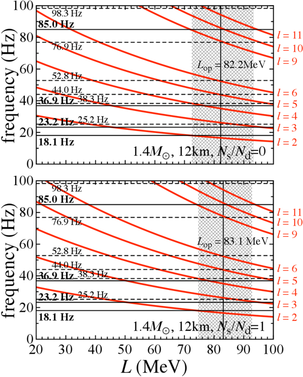 The rest-frame frequencies, ν0, listed in Table 1 (except for 205.6 Hz) identified with the fundamental frequencies of crustal torsional oscillations with various values of ℓ, for the NS model with 1.4⊙ and 12 km. The top and bottom panels correspond to the results with Ns/Nd = 0 and 1, respectively. The horizontal solid lines with the QPO frequencies written in bold font are frequencies with statistical significance greater than or equal to 3σ, while the dashed lines with the QPO frequencies written in thin font are those with significance less than 3σ. The vertical lines denote the optimal value of L (denoted by Lop) to identify the QPO frequencies with the fundamental frequencies of the crustal torsional oscillations, while the shaded regions denote Lop ± 1σ.