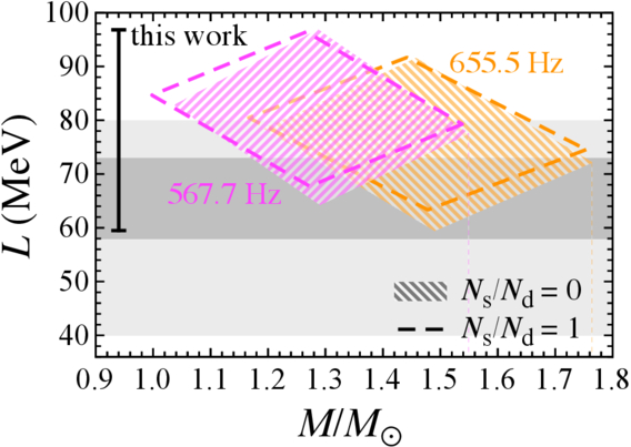 Constraint on L obtained by identifying the QPO frequencies with crustal torsional oscillations, together with the experimental constraint on K0. The shaded region with hashed lines and the region enclosed by the dashed line denote the constraints on L, for stellar models with Ns/Nd = 0 and 1, respectively. From our analysis, we find L = 59.5–96.8 MeV. The fiducial value of L from experiments, L = 60 ± 20 MeV (M. B. Tsang et al. 2012; W. G. Newton et al. 2014; B.-A. Li et al. 2019), and the constraint obtained from the analysis of magnetar QPOs, L = 58–73 MeV (H. Sotani et al. 2018; H. Sotani 2024), are also shown with the light and dark gray shaded regions, respectively.