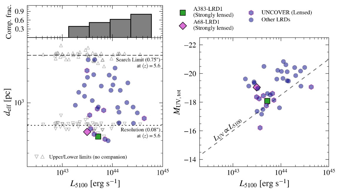 Left panel: effective projected separation between the compact red component and its associated companion(s) as a function of the inferred luminosity L5100. The luminosity is measured using the NIRCam filter closest to rest-frame 5100 Å and converted to a luminosity using the source redshift. The top panel shows the companion fraction as a function of luminosity; we find a striking trend where the companion fraction increases with L5100, reaching nearly ≧80%–100% completeness for the most luminous LRDs in our sample. Right panel: the UV magnitude of the companion(s) (rest-frame 1500 Å) as a function of L5100, indicating that companions associated with these high-luminosity LRDs are themselves significantly brighter in the UV.