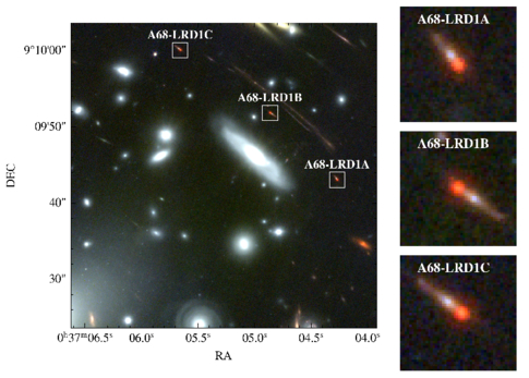 RGB composite of the A68 cluster field, constructed from F444W+F356W (red), F277W+F200W (green), and F150W+F115W+F090W (blue), showing the three lensed images of A68-LRD1. The imaging is publicly available from the VENUS collaboration (Program ID: GO 6882; PI: S. Fujimoto).