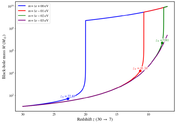Mass evolution of a 10 M⊙ seeding black hole from z = 30 to z = 7, including Eddington accretion and relativistic SIDM Bondi inflow. Shown are four representative SIDM masses, m = 1, 10−1, 10−2, and 10−3 eV, evolved in a Press–Schechter median halo enhanced by an order of magnitude with a total SIDM supply fraction fhalo = 0.9. The heavier SIDM reaches the transition mass M⋆ (at the corresponding redshift z⋆, marked by crosses) earlier and experiences a rapid growth phase until saturating at the finite halo supply. These results demonstrate that the accretion process involves three stages: (i) a long early-time Eddington-dominated phase; (ii) a supply-limited Bondi-dominated phase starting around z = z⋆ and ending at z = zB after exhausting the SIDM of the inner-halo core, indicated by the sharp turns into a universal plateau; and (iii) a late-time Eddington-dominated phase, i.e., shown by the plateau.