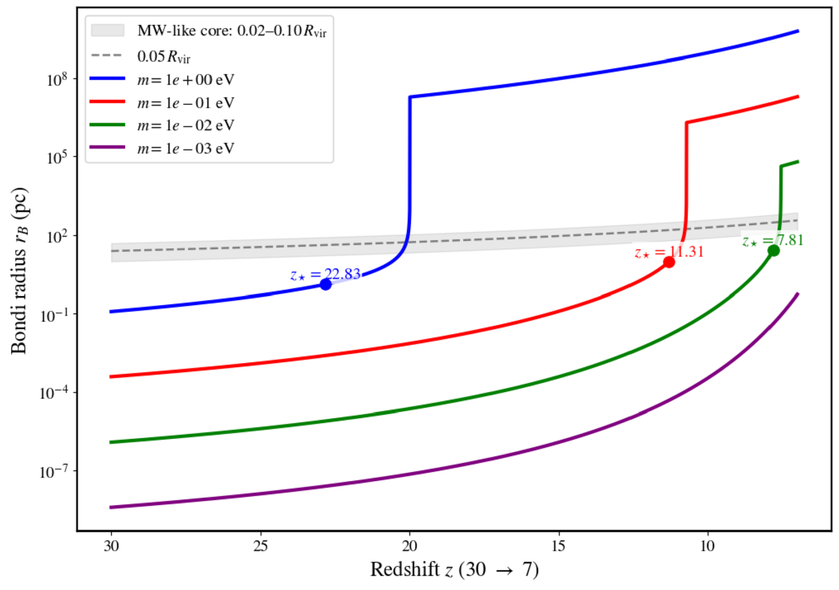 Counterpart evolution of the Bondi radius rB(z) of Figure 1, assuming the average-halo density of Equation (12). The y-axis is in parsecs (logarithmic), while the x-axis is linear in redshift from z = 30 (left) to z = 7. This demonstrates how the Bondi radius expands across cosmic epochs, eventually approaching or crossing the Milky Way–like inner-halo scale (﹩{r}_{{\rm{core}}}\approx 0.05{R}_{{\rm{vir}}}﹩, represented by the gray dashed line and shaded band). This enables efficient SIDM feeding in the late growth phase to form SMBHs with masses ≥109M⊙ if the crossing occurs at z > 7.