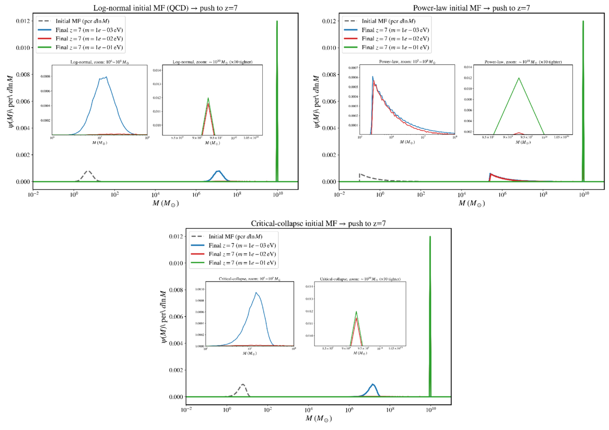 Evolution of the QCD PBH mass function for lognormal (top), power-law (middle), and critical-collapse (down) distributions to z = 7 under SIDM–Bondi-aided Eddington accretion with DM mass m = 10−3,−2,−1 eV. The growth triggers early Bondi dominance for m ≳ 10−2 eV to reach 1010M⊙ SMBHs. The insets in each figure show the finer structures of the final mass function.