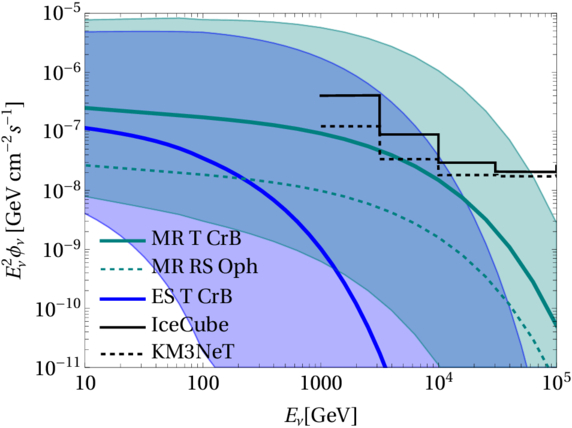 Muon neutrino flux from MR model (shown in green) compared with that from the ES model (shown in blue) for T CrB. The green curves depict the fluxes for T CrB (solid) and RS Oph (dotted) corresponding to the benchmark parameters in Table 2, whereas the green band shows the uncertainties due to parameter variations. The sensitivities of IceCube and KM3NeT are same as in the Figure 2.