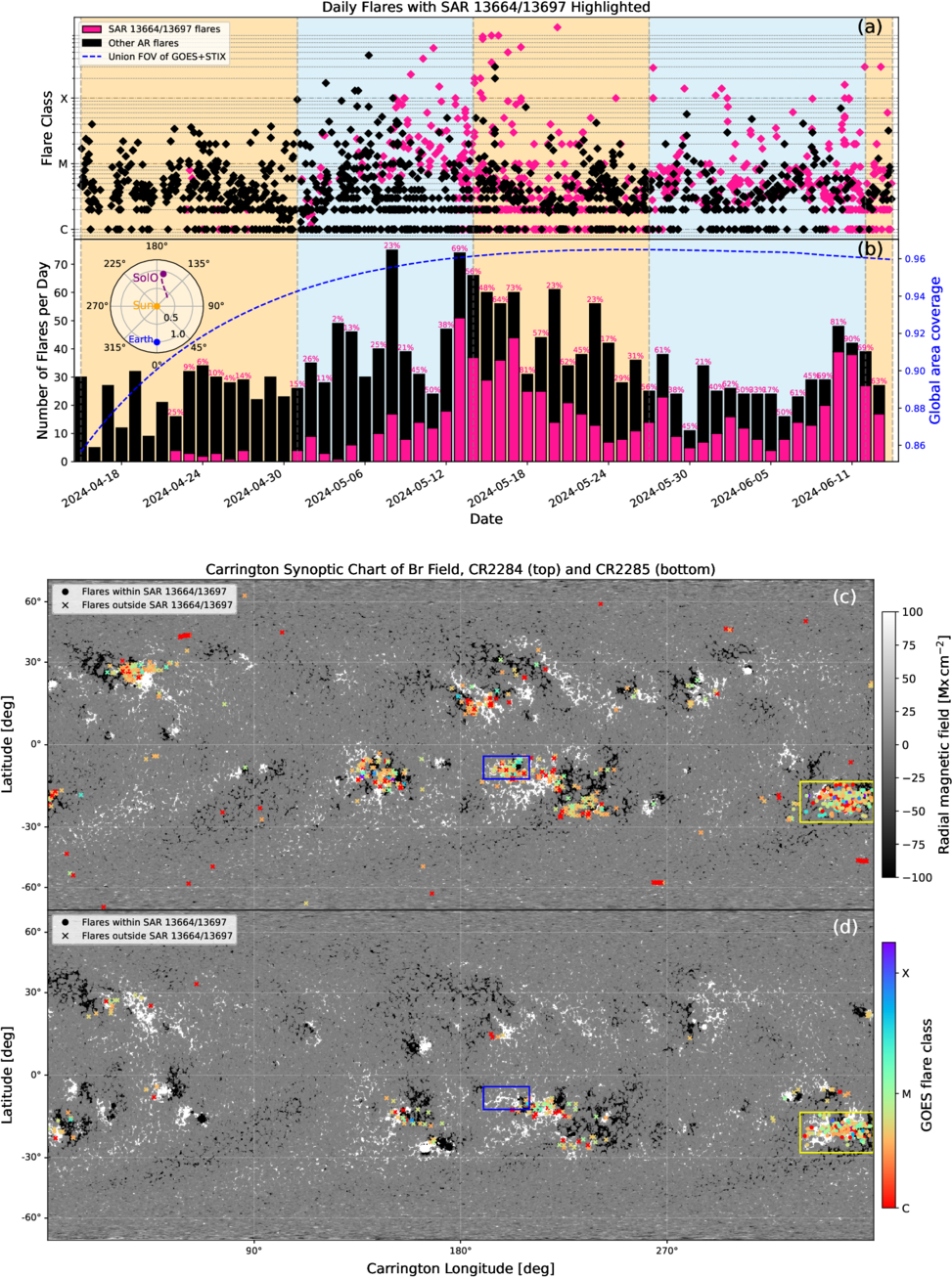 Overview of global flares occurring during the SAR 13664/13697 lifetime. Panels (a) and (b) shows the flare magnitude and count number of flares on a daily basis with flares within (outside) SAR 13664/13697 in pink (black) colors. The light-blue and light-orange shades indicate the time interval during which SAR 13664/13697 was on the near side (observed by GOES) and far side of the Sun (observed by STIX), respectively. The blue dashed curve plots the percentage of the global area covered by the joint perspective of GOES and SolO. The fraction number on the top of bars in (b) gives the daily percentage of SAR 13664/13697 flares over all the flares. The inset illustrates in the ecliptic plane the relative positions of the Sun (orange), Earth (blue), and SolO (purple) as well as its trajectory during the SAR 13664/13697 lifetime. Panels (c) and (d) show the spatial distribution of flares that occurred during the Carrington rotation 2284 (2024 May 6–June 2) and 2285 (June 2–29), respectively. The “o” (“x”) symbol marks flares within (outside) SAR 13664/13697. The flare magnitude is color-coded, from strong (purple) to weak (red). The yellow (blue) box marks the range of SAR 13664/13697 (AR 13679/13711).
