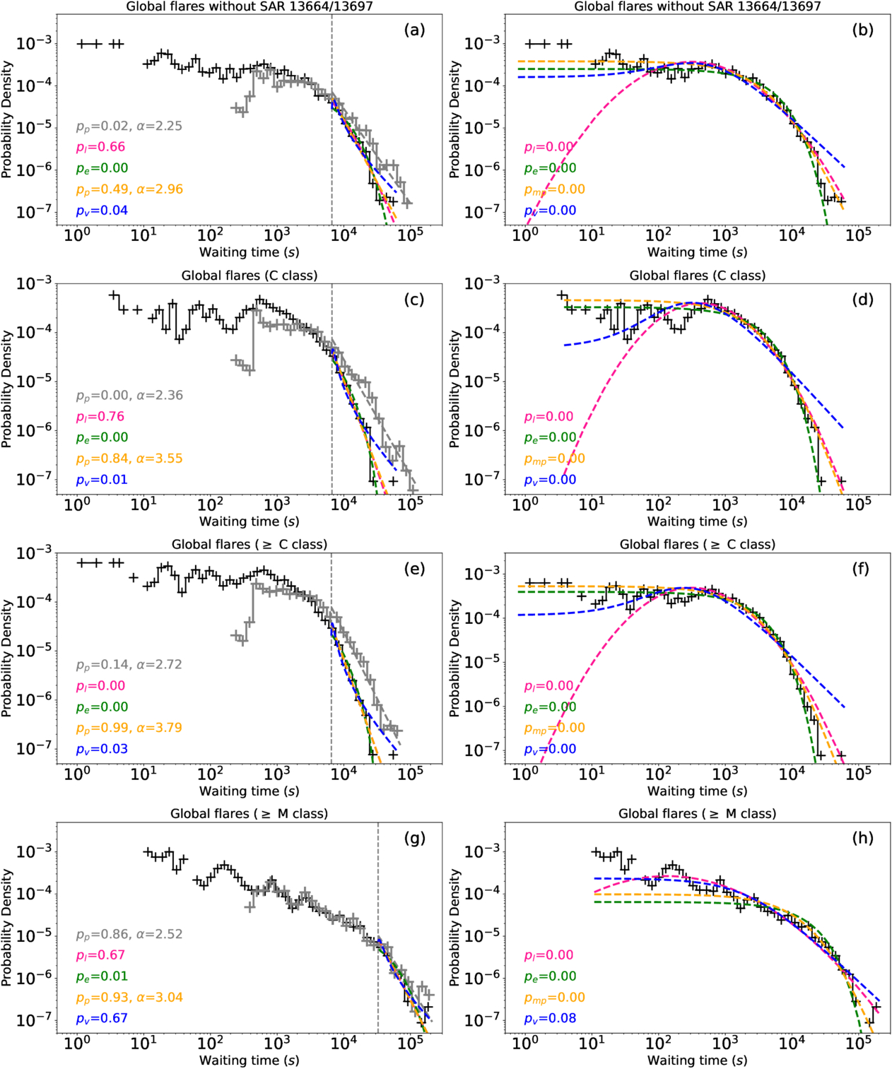 WTDs of global flares. The format is the same as Figure 2. For the WTD in the same row, left (right) panel shows the fitting of the tail portion (overall profile). In the left column, the corresponding WTD of near-side flares observed by GOES is shown in gray; its tail, starting from the same ﹩{x}_{{\rm{\min }}}﹩ as that of the global WTD, is fitted by a power law, and the resultant p-value and power-law index are annotated.