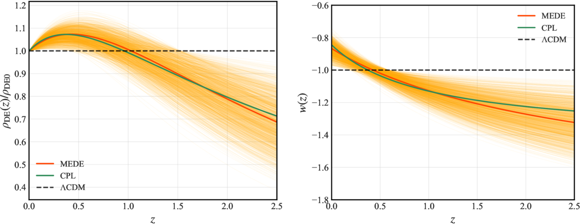 Redshift evolution of the dark-energy sector. Left: the dark-energy density ρDE(z)/ρDE0. Right: the equation of state wDE(z). The red solid line represents the best-fit MEDE model (CMB+DESI+PantheonPlus). The light-orange region shows the 2σ confidence region derived from MCMC chains, illustrating the posterior distribution of parameters. The green solid line shows the CPL parameterization ((CMB+DESI+PantheonPlus best-fit), and the black dashed line represents ΛCDM. The MEDE model exhibits a smooth transition around zt ∼ 0.42, crossing the phantom divide w = −1 from phantom-like (w < −1) at high redshifts to quintessence-like (w > −1) at low redshifts.
