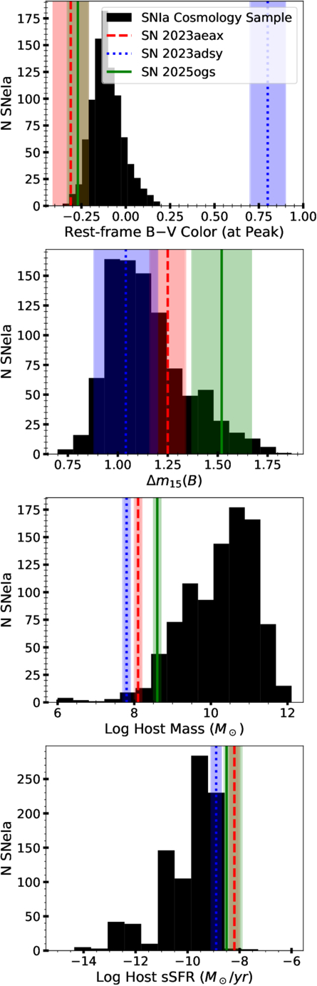 The distributions of rest-frame B – V color at peak B-band brightness, Δm15(B), and host-galaxy properties measured for the cosmological sample of SNe Ia presented in D. Brout et al. (2022). The vertical lines with shaded 1σ uncertainties are SN 2025ogs (green solid line) and the other spectroscopic SNe Ia, namely SN 2023adsy (blue dotted line) and SN 2023aeax (red dashed line).