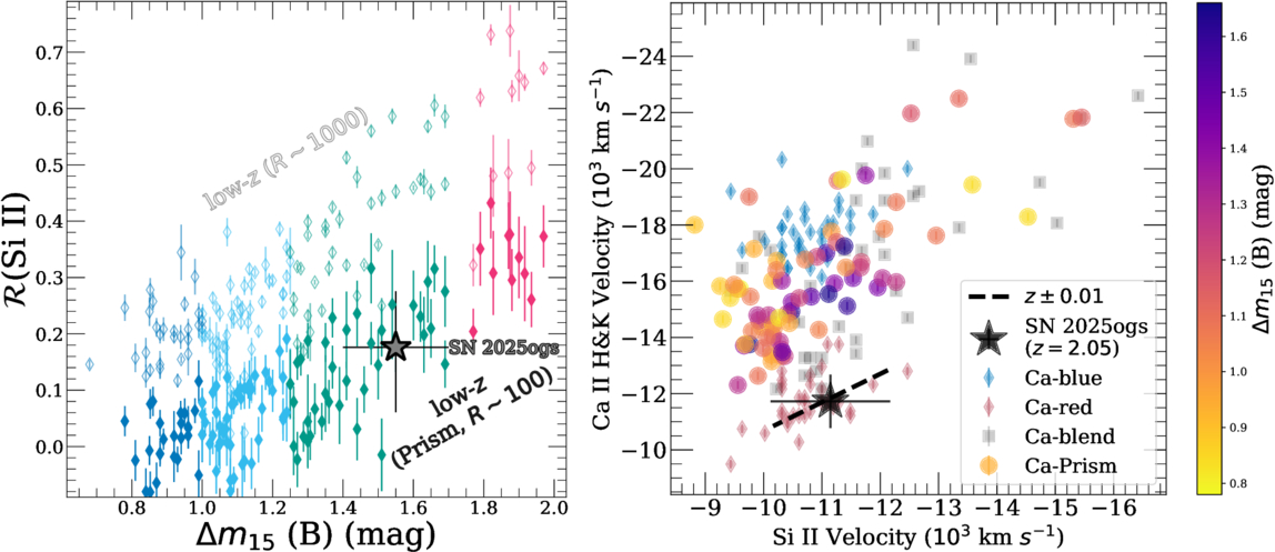 Left: comparison of ﹩{ \mathcal R }﹩(Si II) (the ratio of the absorption depth of Si II λ5972 to Si II λ6355; P. Nugent et al. 1995) of SN 2025ogs (black star) to the low-z sample (colored points) vs. Δm15(B). The color of each point references the corresponding composite spectrum (from Figure 6) to which these SNe contribute. The open points correspond to measurements derived from the individual spectra at their original resolution. The closed points result from convolving these individual spectra with the NIRSpec prism dispersion function and remeasuring ﹩{ \mathcal R }﹩(Si II). Right: comparison of the Si II and Ca II H and K ejecta velocities of SN 2025ogs (black star) to the low-z sample (colored points) using the techniques illustrated in Figure 8. Light-colored diamonds correspond to measurements from the low-z sample using spectra at their original resolution. The red points result from the photospheric component of Ca II H and K, while the blue points are from the HV component. The gray squares (“Ca-blend”) represent velocities measured from the minimum of the Ca II H and K feature when two separate components are not clearly visible. The colored circles (color indicating the value of Δm15(B)) result from measuring the minimum of Ca II H and K after convolving the low-z spectra with the NIRSpec prism dispersion function. The black dashed line indicates how the conservative uncertainty on redshift (z ± 0.01) would impact the ejecta velocity measurements of SN 2025ogs. While the Si II velocity is consistent with the low-z sample, the Ca II H and K velocity is significantly lower.