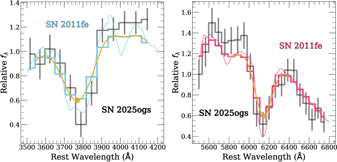 Left: example measurement of the JWST prism-convolved Ca II H and K ejecta velocity that can be inferred from NIRSpec prism spectra at this redshift. The thin-blue colored curve is SN 2011fe at peak brightness in its original resolution. The thick blue colored curve is the same spectrum, but convolved with the NIRSpec prism dispersion function. We measure the velocity from the minimum of the yellow curve (smoothed and interpolated from the thick blue curve). At this resolution, the low-velocity photospheric component and HV component cannot be independently measured. We show SN 2025ogs (black curve) for comparison, where the minimum of Ca II H and K is less blueshifted. Right: same as the left panel, but for Si II. Here, there is only one velocity component contributing to the measurement.