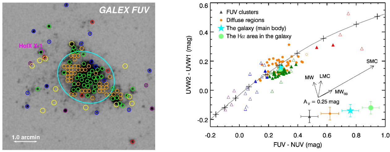 Left: GALEX-FUV inverse-brightness image for Holmberg IX, where the FUV clusters, the diffuse regions, and the main body of the galaxy as a whole, the Hα-emission area in the galaxy, HoIX X-1, and the foreground stars are marked. Cyan ellipse, yellow and magenta circles are the same as assigned in Figure 1; all of the other circles represent photometric apertures for the FUV clusters and the diffuse regions. The apertures for the FUV clusters are color-coded by FUV−NUV: FUV−NUV < 0.0 mag (purple), 0.0 ≤ FUV−NUV < 0.2 mag (blue), 0.2 ≤ FUV−NUV < 0.4 mag (green), and FUV−NUV ≥ 0.4 mag (red); the apertures for the diffuse regions are in orange. The scale ruler at the bottom left corner indicates the 1﹩\mathop{.}\limits^{{\rm{^{\prime} }}}﹩0 length; north is up, and east is to the left. Right: UVW2−UVW1 as a function of FUV−NUV for the FUV clusters (triangles), the diffuse regions (orange circles), the main body of the galaxy as a whole (cyan-filled star), and the Hα-emission area in the galaxy (green-filled circle), with a GALAXEV model curve superimposed (gray solid line). The FUV clusters and the diffuse regions inside the cyan-elliptical aperture are represented by filled symbols, while those outside that are represented by open ones. The color-coding for the FUV clusters is the same as in the left panel. The model curve shows an age sequence with black crosses marking the positions of the 10 ages, 3.8, 10, 20, 40, 80, 130, 210, 300, 360, and 400 Myr from left to right. The arrows show the vectors predicting the effects of the dust attenuation at the amount AV = 0.25 mag for the Milky Way (MW), the Large Magellanic Cloud (LMC), and the Small Magellanic Cloud (SMC) laws, as well as the attenuation law with the MW-type slope but no 2175 Å bump (denoted as MW0B in the diagram). The quotation and the construction of the attenuation laws are presented in Y.-W. Mao et al. (2014). The median errors for the FUV clusters (blue), the diffuse regions (orange), the main body of the galaxy as a whole (cyan), and the Hα-emission area in the galaxy (green) are plotted at the bottom right corner.
