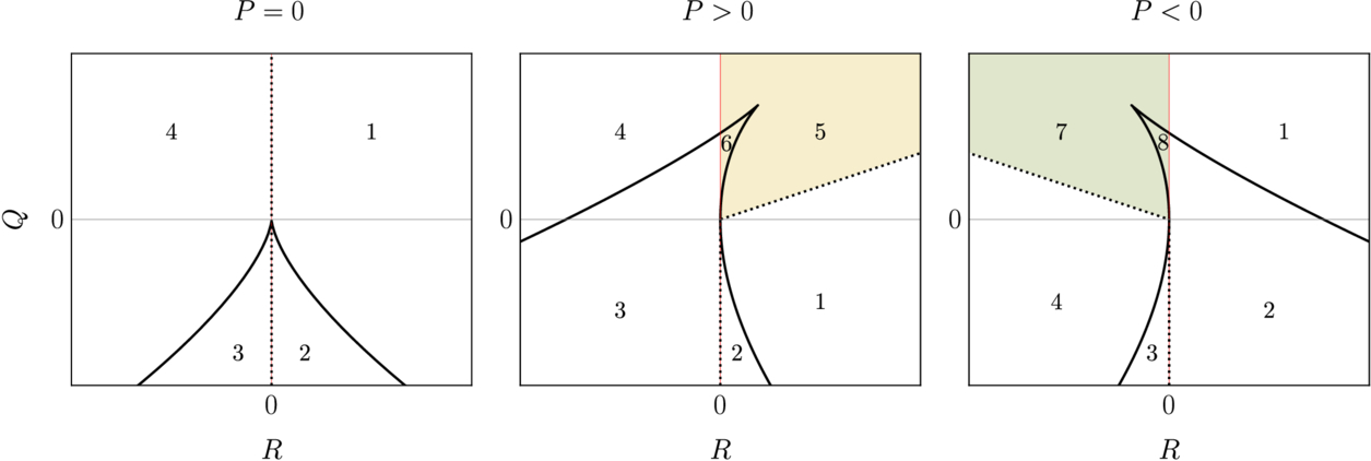 Sketch of the local streamline topologies in the RQ-plane for the three cases P = 0 (left), P > 0 (middle), and P < 0 (right). The thick line is the discriminant surface Δ. The red line marks the separation between the stretching and compressing regions, and the dotted line indicate the separation between stable and unstable topologies. Shaded areas indicate topologies associated with local volumetric contraction (yellow) and expansion (green) emerging in compressible cases only.