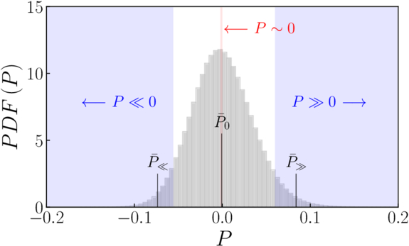 PDF of the first GTGI P = −∇ · u. Shaded areas indicate P ≪ 0 and P ≫ 0 (blue) and P ∼ 0 (red) regimes. Vertical lines indicate the median values ﹩{\bar{P}}_{\ll }=-0.06﹩, ﹩{\bar{P}}_{0}=-1.2\times 1{0}^{-3}﹩, and ﹩{\bar{P}}_{\gg }=0.07﹩ inside each subset.
