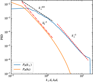Reduced 1D perpendicular and parallel spectra of magnetic field fluctuations with respect to the mean magnetic field. Dashed and dotted–dashed lines represent typical slopes expected in inertial and Hall ranges that serve as reference.
