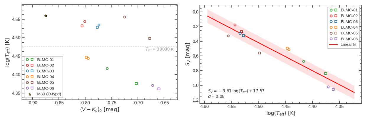 (left) Color–temperature diagram for components of our systems. The colors clearly overlap, yet the temperatures of more massive O-type stars differ significantly from those of B-type ones. The position of the M33 O-type system is consistent with our O-type sample. (right) SB versus temperature. Although the scatter is higher, a common relation for O- and B-type stars can be derived.