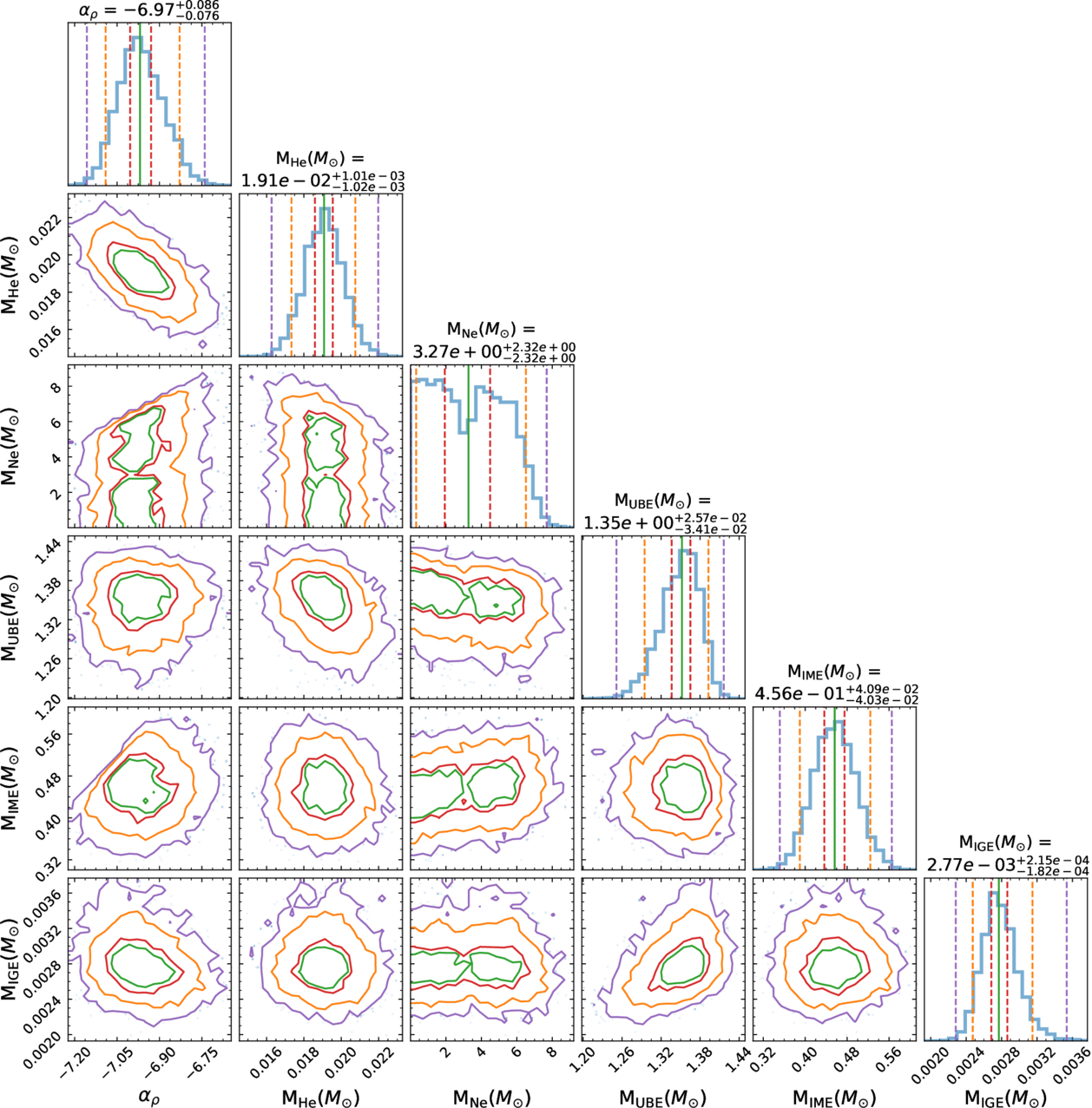 The corner plot of the marginalized posterior parameters over fσ. The elemental masses presented in this plot are the elemental masses above vinner in the ejecta. We group C and O as the UBEs; Na, Mg, Si, S, and Ca as the IMEs; and Ti, Cr, Fe, and 56Ni as the IGEs. The contour lines denote the 50%, 68%, 95%, and 97% quantiles and are color-matched to the vertical quantile markers in the diagonal histograms.