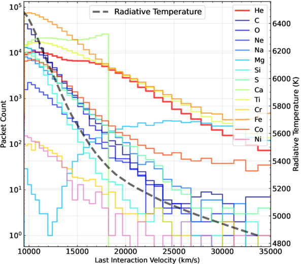 The last line interaction velocity distribution of the TARDIS simulation run with the MAP parameter set. Each line represents the velocity distribution of the packets that line-interact with a specific element as their last interaction before crossing the outermost simulation boundary.