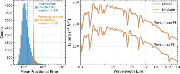 Left: distribution of the mean fractional error in flux evaluated using the test dataset and posterior parameter samples. The vertical dashed lines mark the median of each distribution. Right: the comparison of the TARDIS and emulator spectra of two parameter sets that yield the worst fractional errors within the sampled posterior set.