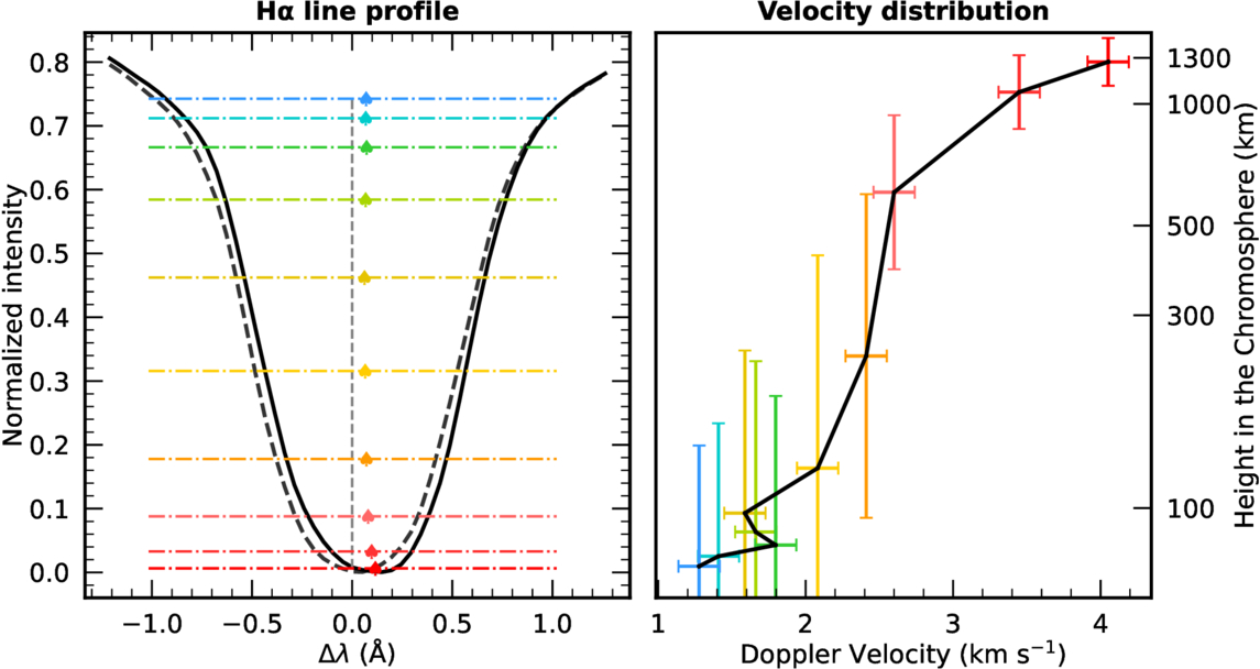 Left panel: normalized Hα spectral profile of the Moreton wave front at 12:55:47 UT (solid black line) and the spectral profile of the reference quiet region (dashed black line), where the vertical dashed gray line indicates the line center in the rest frame of reference. The colored horizontal lines (from bottom to top) mark the wavelength windows from ±0.1 to ±1.0 Å. The colored dots indicate the bisector offset of each wavelength window (corresponding to certain heights in the chromosphere). Right panel: derived Doppler velocity of the Moreton wave as a function of chromospheric height based on the bisector method.