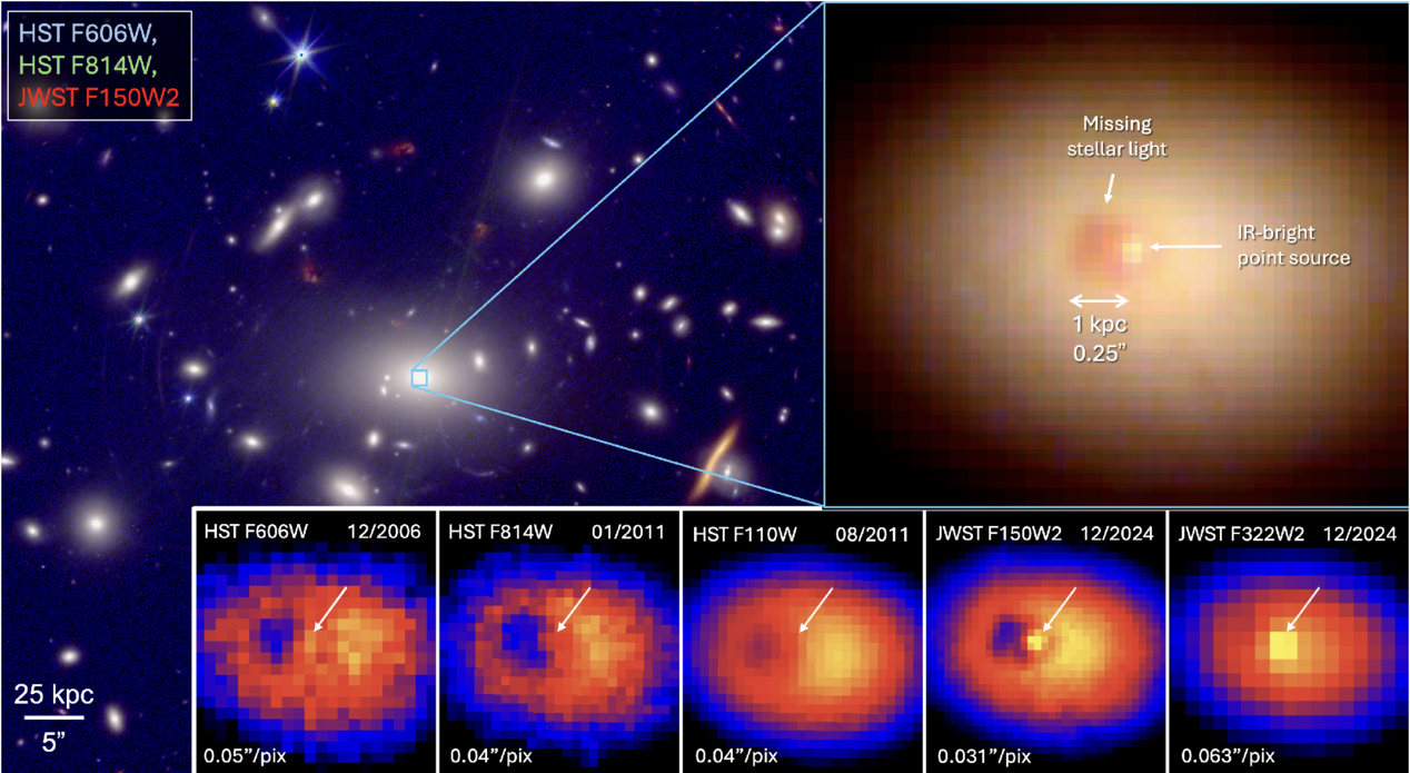 Multiwavelength observations of the central galaxy in A402. Left: three-color image of the cluster core based on data from HST and JWST (north is up, east is left). Upper right: zoom-in of the inner 2″ × 2″ of the central galaxy in A402. This zoomed image reveals a 0﹩\mathop{.}\limits^{\unicode{x02033}}﹩25 wide cavity in surface brightness, as well as a bright point source on the western edge of the depression. Lower right: images of the inner region of the central galaxy in five different filters at four different epochs. The point source (depicted with a white pointer in all panels) is brightest in the redder JWST band, where the combination of the bright point source and degraded PSF obscures the presence of any cavity.