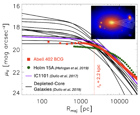 This figure shows, in red, the F150W2 surface brightness profile extracted from the central galaxy in A402-BCG along a wedge as shown in the inset. For comparison, we show the galaxies with the largest cores measured to date, Holm 15A (K. Mehrgan et al. 2019) and IC 1101 (B. T. Dullo et al. 2017), and a sample of cored galaxies from B. T. Dullo (2019). All profiles have been corrected for cosmological dimming and k-corrected to the rest-frame V band assuming an old stellar population. The vertical red dotted line shows the location of the break radius measured from the two-dimensional fit described in Appendix A.1. This figure highlights the similarities between IC 1101 and A402-BCG, and suggests that A402-BCG likely harbors an ultramassive black hole.