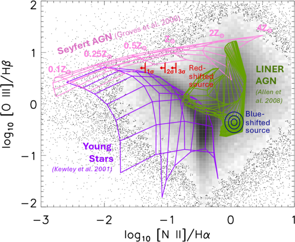 Line ratio diagram, comparing high-ionization ([O III]/Hβ) and low-ionization ([N II]/Hα) line ratios (J. A. Baldwin et al. 1981), which separates star-forming regions from active galactic nuclei and is insensitive to the effects of dust. The black/gray points in the background represent 85,224 galaxies with spectra from the Sloan Digital Sky Survey (L. J. Kewley et al. 2006). Where the point density becomes sufficiently high, we transition to a 2D histogram. There is a dense locus of points that are consistent with predictions for H II regions (L. J. Kewley et al. 2001) (purple grid). The blueshifted source on the western side of the stellar cavity has line ratios consistent with LINER AGN (T. M. Heckman 1980; M. G. Allen et al. 2008; green grid) and is inconsistent with models of star formation. The redshifted source on the eastern side of the stellar cavity has no detectable [N II] emission, and so appears here as an upper limit in [N II]/Hα. This source is fully consistent with models of Seyfert-like AGN with low-metallicity gas (B. A. Groves et al. 2006) (pink grid), but is also marginally consistent with a very young and energetic starburst. We rule out the latter scenario based on the lack of blue continuum emission, which would have been clearly visible in the archival HST data at F606W.