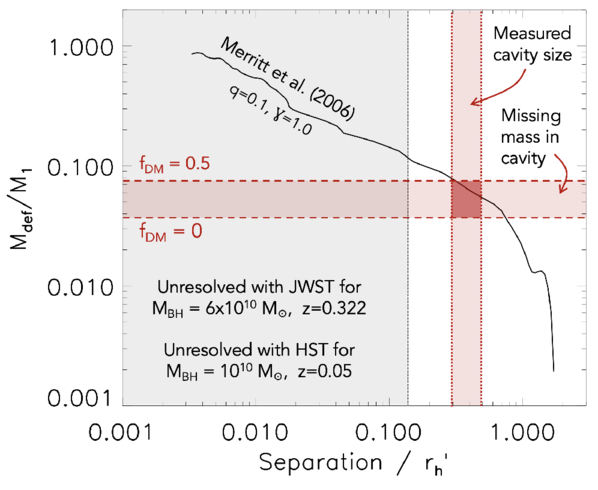 An example simulation from D. Merritt (2006) showing the amount of mass in stars and dark matter scattered to larger radius during three-body encounters from a binary SMBH as a function of binary separation—both axes are scaled by a scale factor related to the mass of the binary, making this prediction mass independent. The simulation shown is for a 10:1 (q = 0.1) binary in a galaxy with a slight stellar cusp (γ = 1.0), which was the only parameter set shown in D. Merritt (2006) and is used here for illustrative purposes. While, eventually, the amount of missing mass approaches the total mass of the binary, the missing mass is expected to be closer to 10% for measurable separations in black holes with M > 1010 M⊙. For the central galaxy in A402, we measure a stellar mass deficit of 2 × 109 M⊙, which could be a factor of ∼2 higher for realistic dark matter fractions in the centers of elliptical galaxies (M. W. Auger et al. 2010; M. Barnabè et al. 2011). Coupling this with the measured separation (1.2 ± 0.3 kpc), and normalizing these to the primary SMBH mass (M1) and the gravitational sphere of influence (﹩{r}_{h}^{\prime} ﹩), we find excellent agreement with theory.
