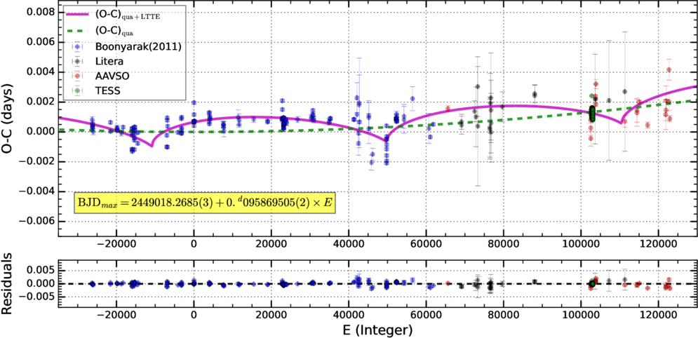 O − C diagram of BE Lyn (with the linear ephemeris subtracted). The top panel shows the data and the best-fit model (magenta solid line), with the quadratic component indicated by the green dashed line. The bottom panel displays the residuals. Data sources are color-coded: C. Boonyarak et al. (2011; blue), historical literature (J. Hubscher et al. 2013; J. Hubscher 2014; J. H. Peña et al. 2015; J. Hübscher 2017; L. Pagel 2021, 2022, 2023; gray), AAVSO (red), and TESS (green).