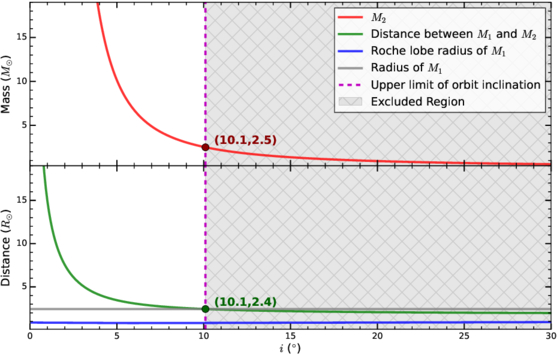Dynamical constraints on the unseen companion. Top: companion mass M2 versus orbital inclination i, derived from the mass function (red curve). Bottom: primary-companion separation at periastron versus i (green curve). The intersection of the primary’s radius R1 (gray curve) and primary-companion separation (green curve) sets the stringent upper limit i ≲ 10﹩\mathop{.}\limits^{\unicode{x000b0}}﹩1 (dark green dot), corresponding to the lower mass limit M2 ≳ 2.5M⊙ (dark red dot). The gray hatched region denotes parameter space excluded.