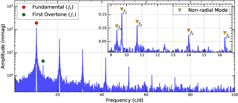 Frequency spectrum of BE Lyn. The main panel (0–100 c day−1) marks the fundamental (f0, red) and first-overtone (f1, green) modes. The inset highlights the low-amplitude, nonradial mode region (∼9–17 c day−1) with a linear y-axis.